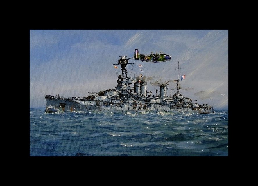 Vichy Battlecruiser Strasbourg in 1941 being overflown by D520's in 'vichy stripe' markings.