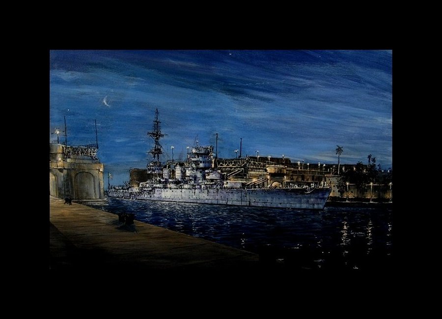 Conte di Cavour in the ship canal moving from Mar Grande the Outer Harbor to Mar Piccolo the Inner Harbor at Taranto in 1940