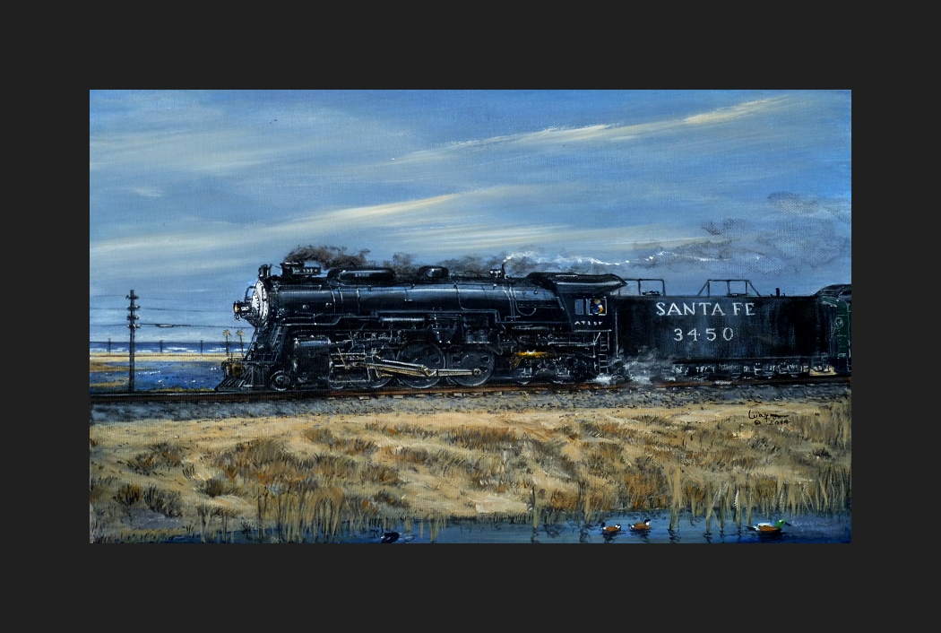 Santa Fe 4-6-4 Hudson type No. 3450 southbound crossing San Elijo Lagoon north of San Diego in 1950