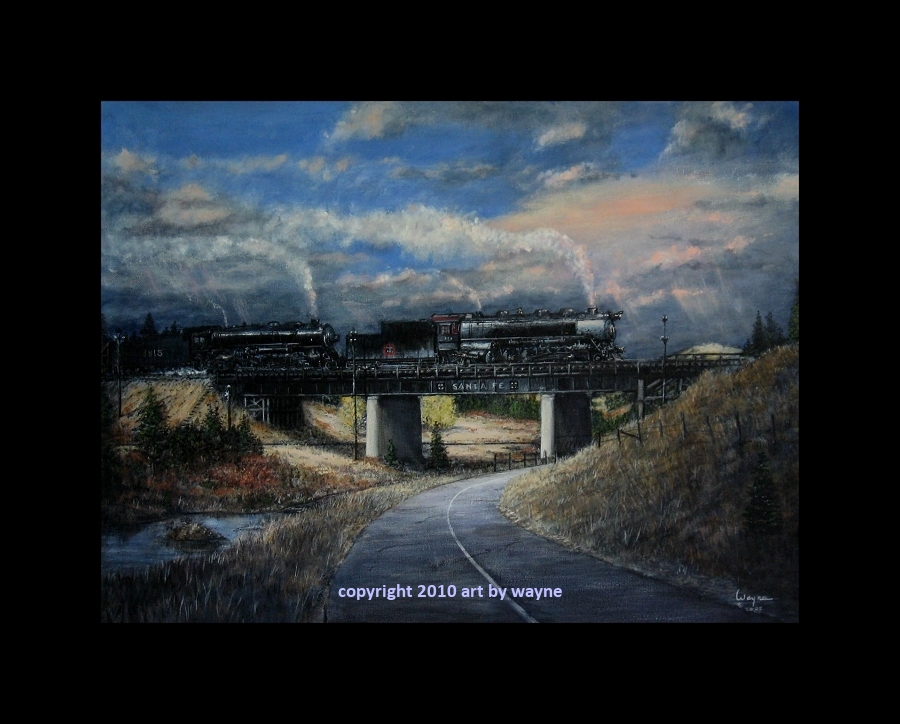 Colorado and Southern Standard Guage 2-10-2 No. 914 double headed with a Santa Fe 2-10-2 No. 3815 crossing the bridge in on the jointed owned line of the C&S and AT&ST at Longmont CO in 1950