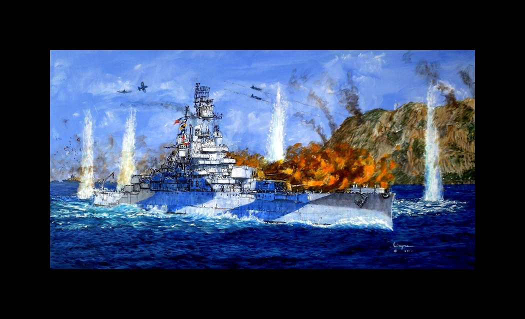 USS Nevada BB36 charges the beach to support navy frogmen clearing landing obstacles who had come under fire from shore batteries.
