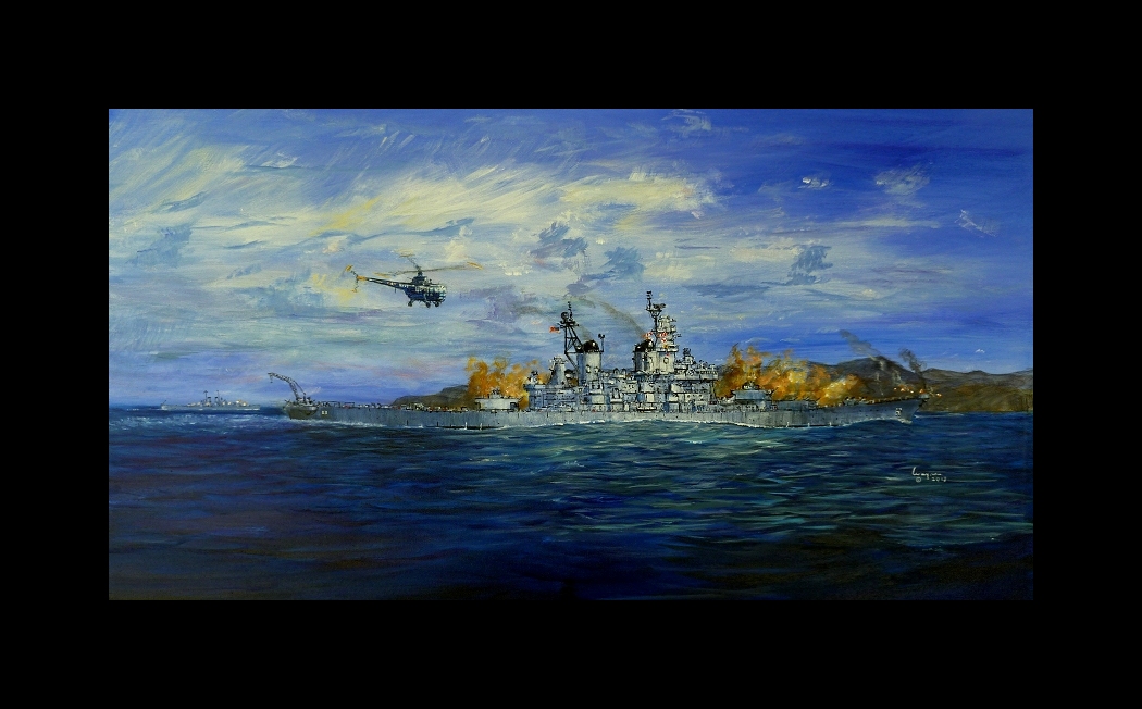 USS Missouri BB63 and USS Toledo CA 133 provide covering fire for a pilot rescue.