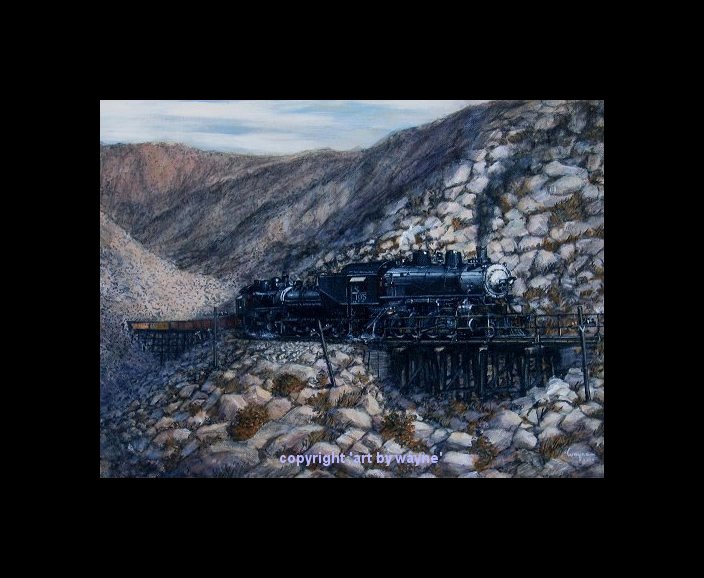 2-8-0 No.105 deep in th heart of Carisso Gorge where the train runs on a ledge on a 1000' cliff above Carisso Creek in 1948